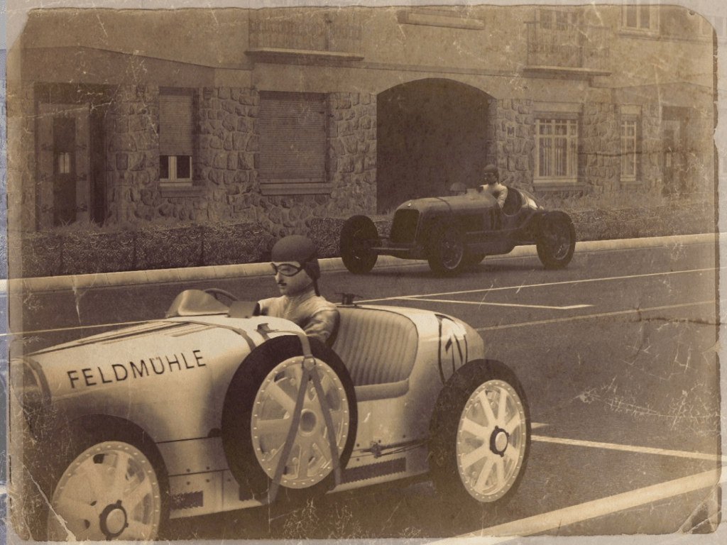 “Well to start with, we had the Auto Union and several Maseratis behind us. Since we used our Voiturette for this race, we had a clear disadvantage in terms of speed. If you look at T1 now *Happe looks and points to the breaking zone of T1* , you can feel my fear, hopefully. We don’t have much room here and every car behind me is much faster and going into a heavy braking zone. To prevent my car to get caught up by crashes in the front, i have to brake very early, so the braking zone for everyone else in the back gets shorter and shorter as well.”