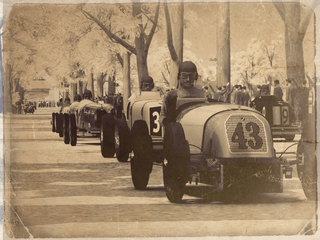 With that, the race was on and shortly after, right before Pulnoy, the heart of Happe was beating a fast pace – Approaching the sharp turn after the long and fast turns, Evadne Cleo, who had crashed right before and spun Aditya Surves Bugatti T51A around, came right through the bushes, driving into the path, that Happe considered his line. Mere centimeters were missing for a horrible crash, that could’ve left 3 cars, including Happe who is pressured to make a good result that day, destroyed.