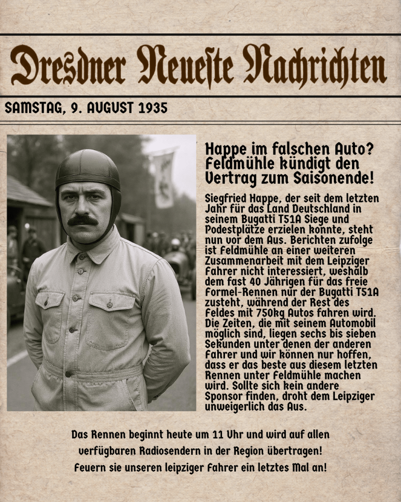 With no particular interest to the sport – Feldmühle decided to pull the plug on Siegfried Happe today, leaving him without any drive for the 1936 season. If there is any chance of him getting a drive in 1936, we cannot confidently say yet, but we will keep you in the loop.